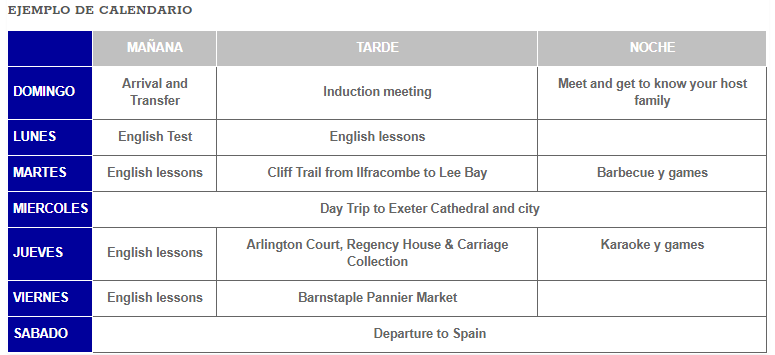 - Programa de actividades semanal: 1 Excursión de día completo, actividades cada tarde de lunes a viernes y 2 actividades